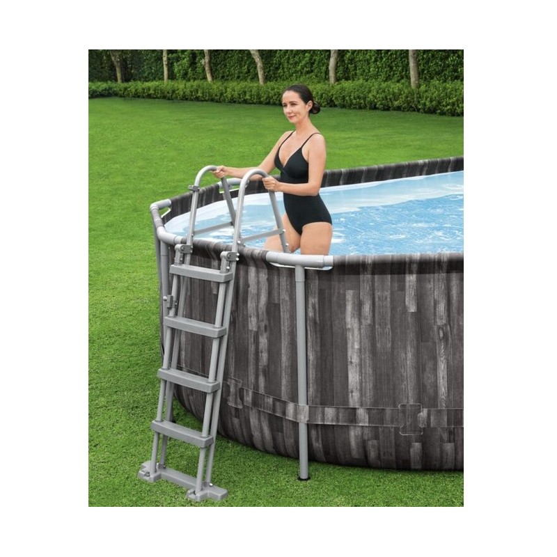 Scala: Scalabilità della sicurezza. E' realizzato in acciaio zincato e laccato in bianco con 6 gradini e frontale estraibile. (Ciò consente di smontare i gradini sul lato esterno per impedire ai bambini di accedere alla piscina ed evitare incidenti).