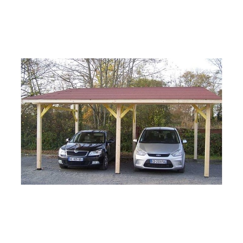Posto auto coperto Monospent in legno massello sezione 12 x 12 cm, con tetto rivestito con scandole bituminose è ideale per un garage coperto di 2 auto, bici e moto.