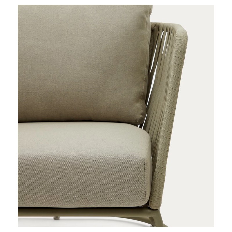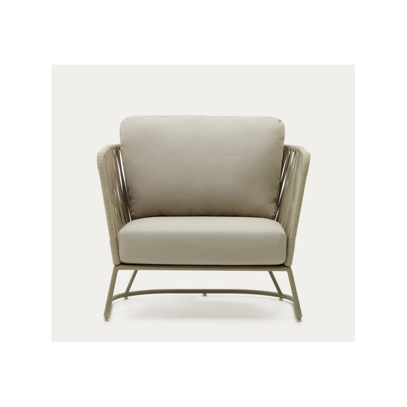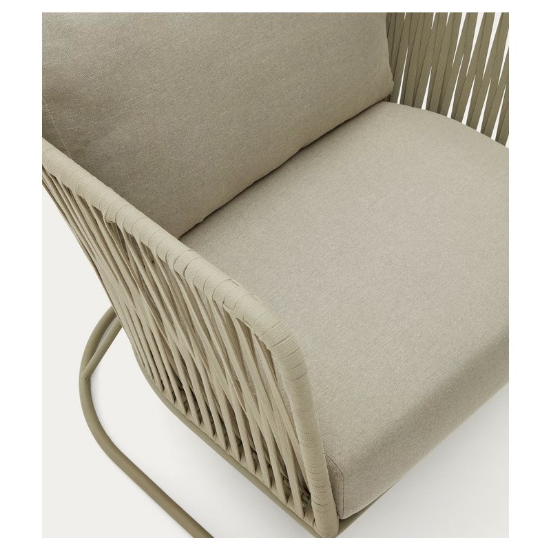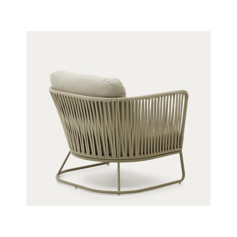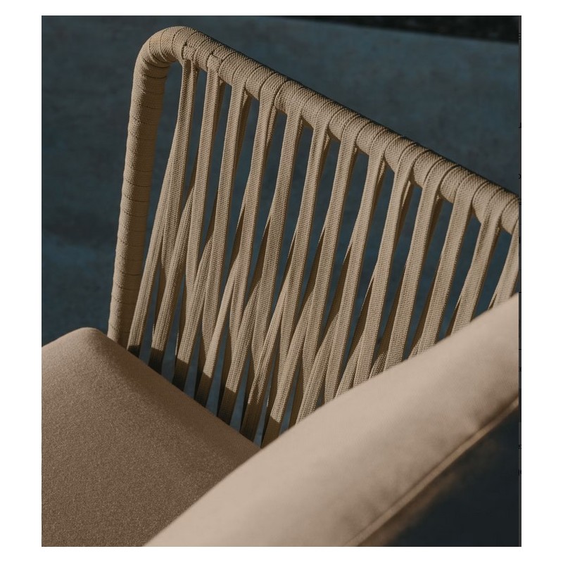 L'intreccio in corda dei braccioli e dello schienale ne ammorbidisce l'aspetto generale, per un perfetto equilibrio tra modernità e convivialità.