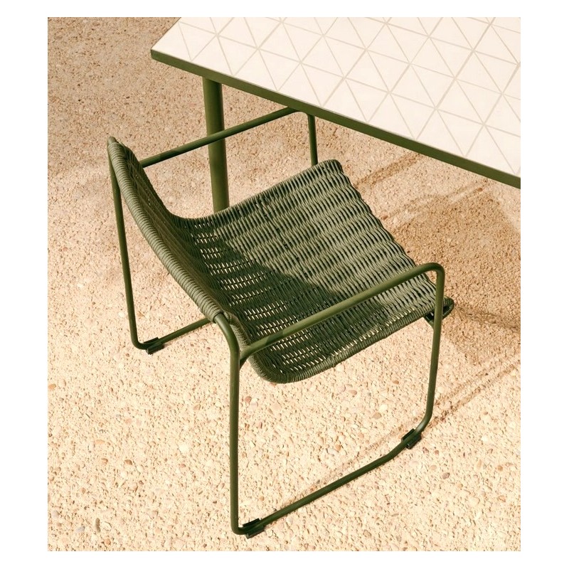 Sedia in acciaio zincato con sedile e schienale in corda verde scuro, intrecciata a mano e resistente ai raggi UV.