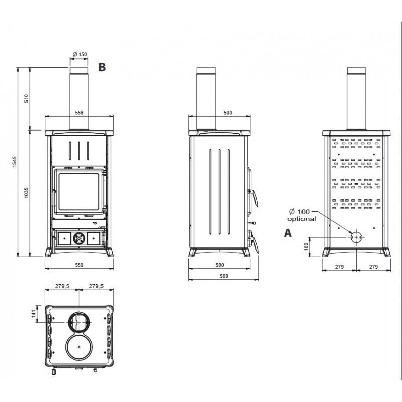 Con una potenza nominale di 13 kW, che permette di riscaldare circa 240 m2. La stufa a legna in ghisa utilizza ceppi di legno fino a 30 cm.