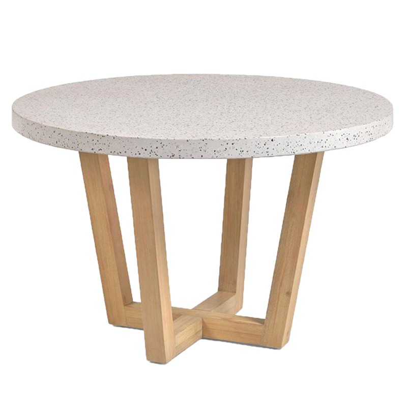 Tavolo rotondo con piano in terrazzo bianco Ø 120 cm e struttura in legno massello di acacia.