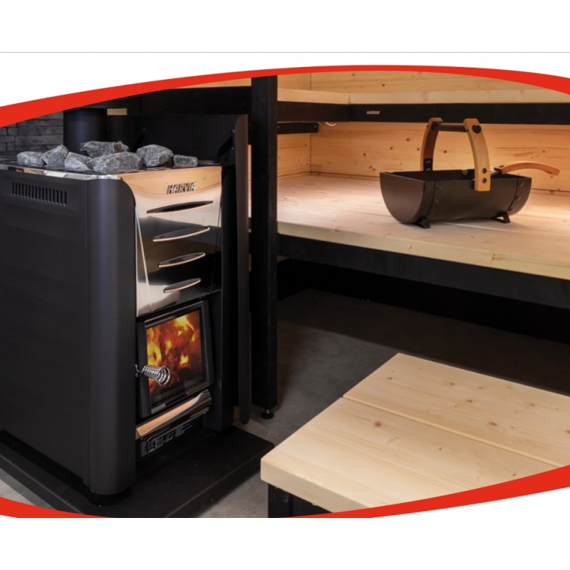 Equipado com uma porta de vidro, e a vista sobre o fogo, a atmosfera de uma sauna com fogão a lenha é excepcional e inimitável.