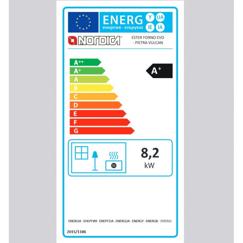 O fogão a lenha com Nordica Extraflame Ester Evo 9,5kW-N forno em Pedra Natural para cozinhar. Com uma potência nominal de 9,5 kW que pode aquecer cerca de 235m3. O fogão a lenha de ferro fundido utiliza toras de madeira de até 30 cm.