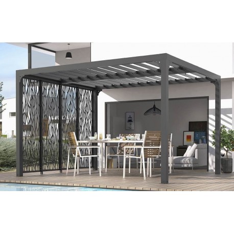 A pérgola tem 3,60 m de comprimento e 3,00 m de largura. E mede 2,31 m de altura. O o telhado é composto por 72 lâminas orientais de alumínio e 5 painéis de disjuntores de aço de projeto de mosaico, colocados em um lado de 3 m.Suas dimensões oferecem uma área de quase 11 m2 que lhe permite cobrir um salão de jardim de 8 pessoas, por exemplo.