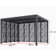 O pergolado tem 3,60 m de comprimento e 3,00 m de largura. E mede 2,31 m de altura. O teto é composto por 72 ripas de alumínio ajustáveis e 9 painéis de 2 telas de aço em estilo mosaico, colocadas em um lado de 3 m e a fachada traseira de 3,60 m. Suas dimensões lhe conferem uma superfície de quase 11 m², o que lhe permite cobrir um mobiliário de jardim de 8 pessoas, por exemplo.