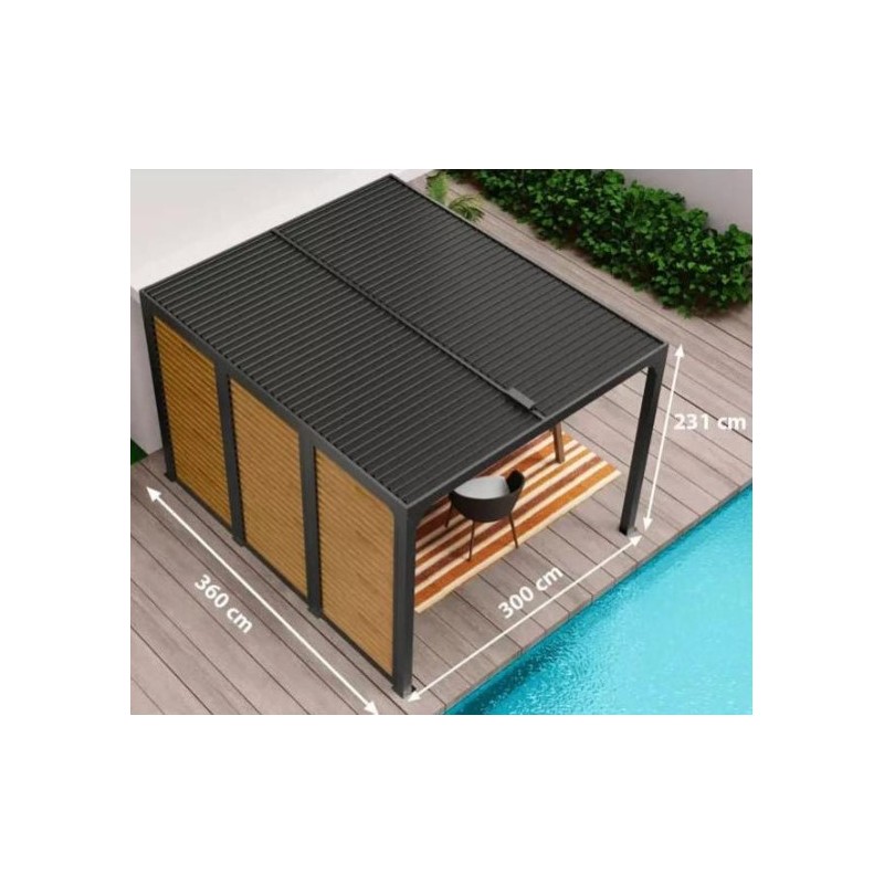 A pérgola bioclimática Habrita em alumínio cinza antracite para varanda e terraço com 2 painéis em ventosas laterais móveis em madeira de imitação para 2 lados de 3,60 m e 3 m permitem proteger de um calado, um raio de sol ou possível oposto.