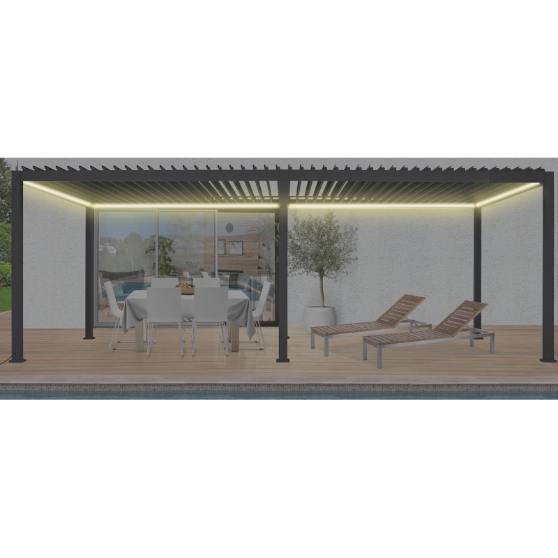 A pérgola bioclimática elétrica Habrita com controle remoto em alumínio cinza antracite para jardim e terraço com ripas ajustáveis de alumínio móvel permite modular a luz e o sol e equipada com fitas de iluminação LED.