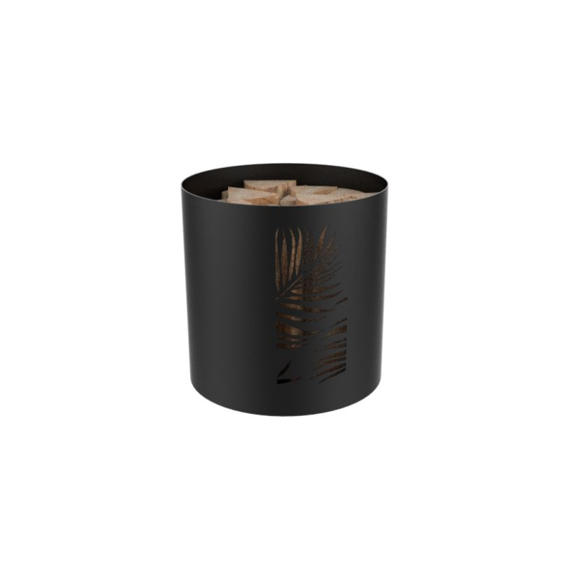Com seu motivo de folhas de palmeira cinzeladas, o organizador de toras de Bornéu se afirma como um objeto decorativo por si só perto do fogão.